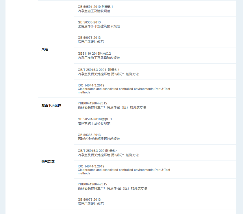 检测领域涵盖温度 / 相对湿度、风量、风速、截面平均风速、换气次数、静压差、悬浮粒子浓度、沉降菌、浮游菌、照度、噪声,对应标准包括 GB 50591、GB 50333 等多项国标,以及 ISO 14644-3、YBB0041 等规范,涉及洁净室、手术室等场景的检测与验收。