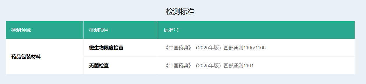 药品包装材料的检测项目包括微生物限度检查和无菌检查,均依据《中国药典》(2025 年版)四部通则,对应通则编号分别为 1105/1106 和 1101。