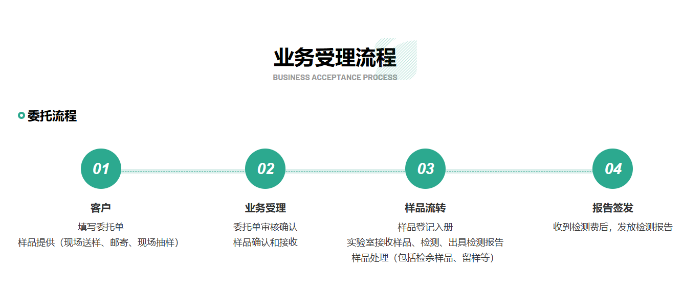 业务受理的委托流程分 4 步:首先客户填写委托单并提供样品(可选现场送样等方式);接着进行委托单审核、样品确认接收;之后样品登记、实验室接收检测并出具报告,同时处理余样;最后收到检测费后发放报告。