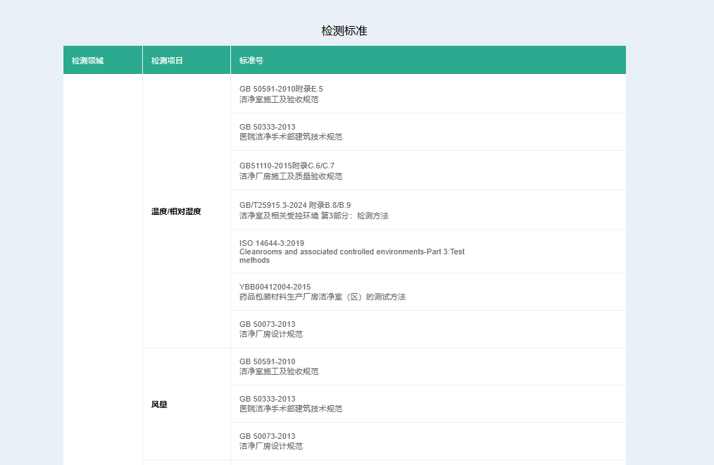 检测领域涵盖温度 / 相对湿度、风量、风速、截面平均风速、换气次数、静压差、悬浮粒子浓度、沉降菌、浮游菌、照度、噪声,对应标准包括 GB 50591、GB 50333 等多项国标,以及 ISO 14644-3、YBB0041 等规范,涉及洁净室、手术室等场景的检测与验收。