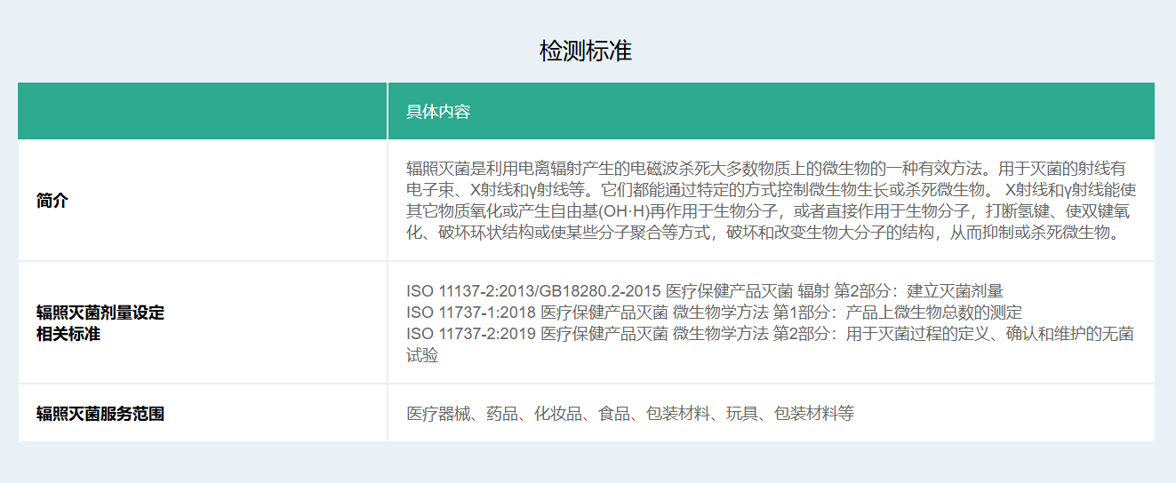 辐照灭菌通过电离辐射破坏微生物结构实现杀菌,剂量设定遵循 ISO、GB 相关标准,服务范围涵盖医疗器械、药品、食品等多类物品。