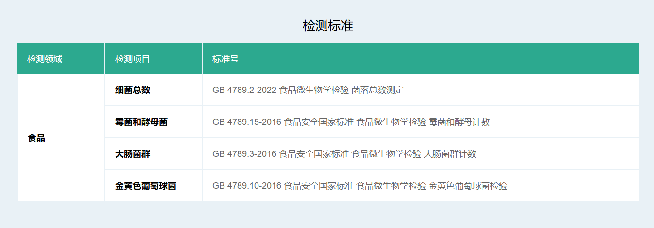 食品领域的微生物检测项目及对应标准:细菌总数依 GB 4789.2-2022,霉菌和酵母菌依 GB 4789.15-2016,大肠菌群依 GB 4789.3-2016,金黄色葡萄球菌依 GB 4789.10-2016。