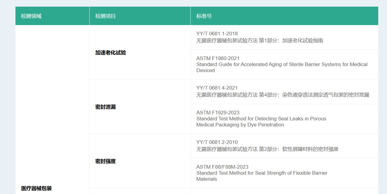 医疗器械包装的检测项目(加速老化、密封泄漏等),对应 YY/T 系列国标及 ASTM 标准,涵盖老化试验、密封性能、包装抗内压等检测方法,满足包装质量验证需求。
