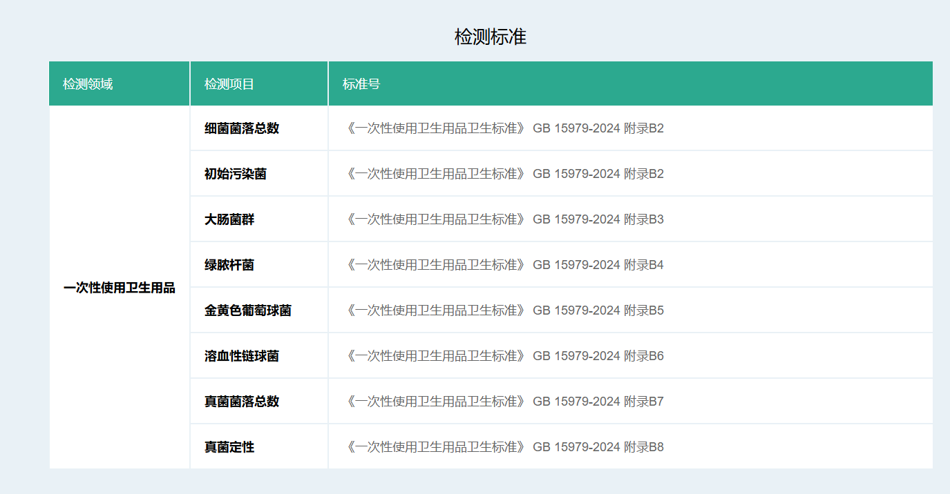 一次性使用卫生用品的检测项目(含细菌菌落总数、大肠菌群等),均依据《一次性使用卫生用品卫生标准》GB 15979-2024,对应不同附录(B2 至 B8)执行检测。