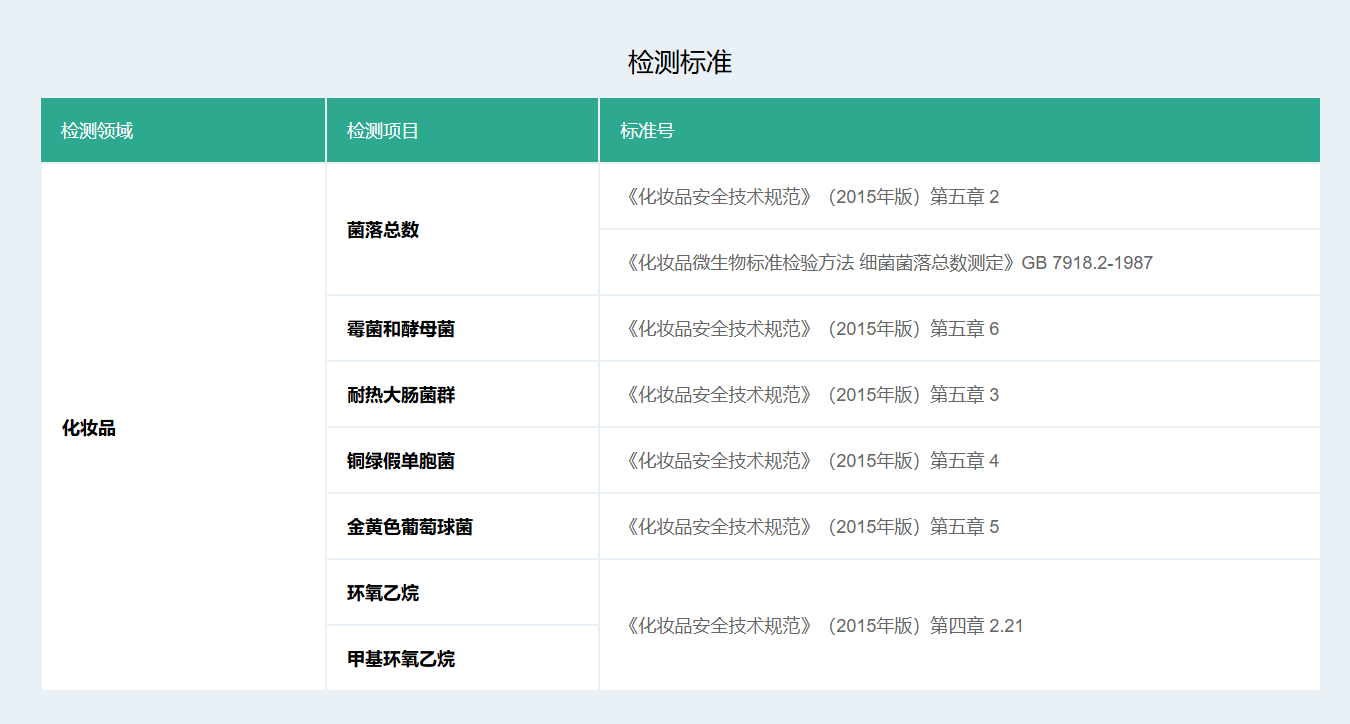 化妆品检测项目(如菌落总数、环氧乙烷等),主要依据《化妆品安全技术规范》(2015 年版)对应章节,其中菌落总数还可参考 GB 7918.2-1987 标准。